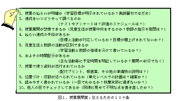 チェックリスト開発の出発点として、発表者(鈴木)が沼野らの提案などをもとにして作成し、教職課程での指導案添削に使用してきた「学習指導案明確化の10ケ条」を用いた(図1)。フローチャートを含めた本時の展開の表現方法については、現在のところ特定の書式を提案するまでに至っていないが、この10ケ条は、少なくとも指導案の初学者には、自ら作成した指導案の明確さをチェックするポイントとして有効に用いられてきた。